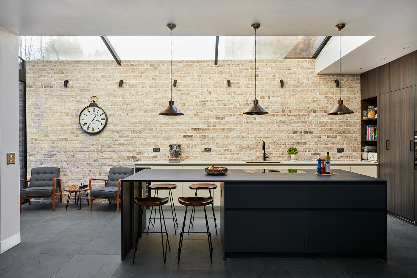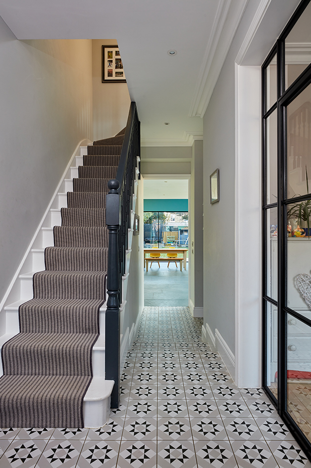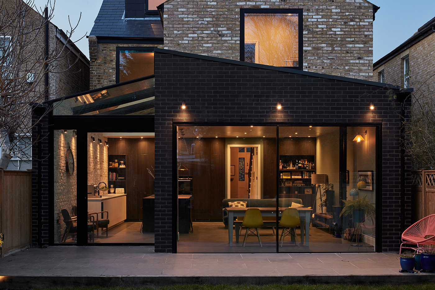 This large wraparound extension in Kingston makes use of asymmetrical form and contrasting material finishes to visually separate the new extension from the existing period property.