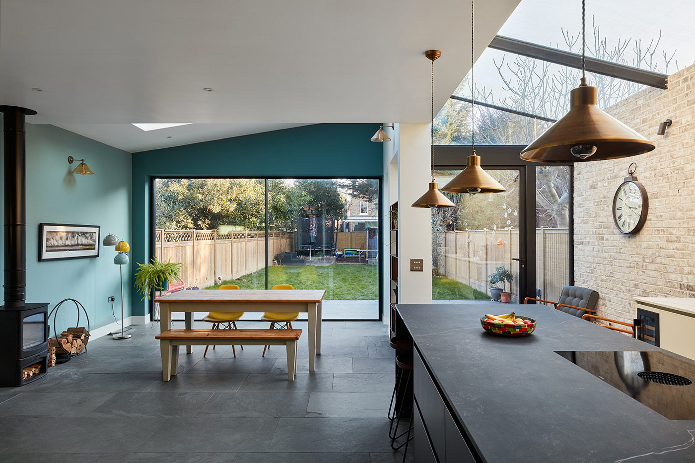 A large glass roof brings plenty of natural light into the open plan kitchen, living, and dining space while minimal framed sliding doors and a large pivot door create a seamless transition between indoor and outdoor living, making it a perfect space for entertaining.
