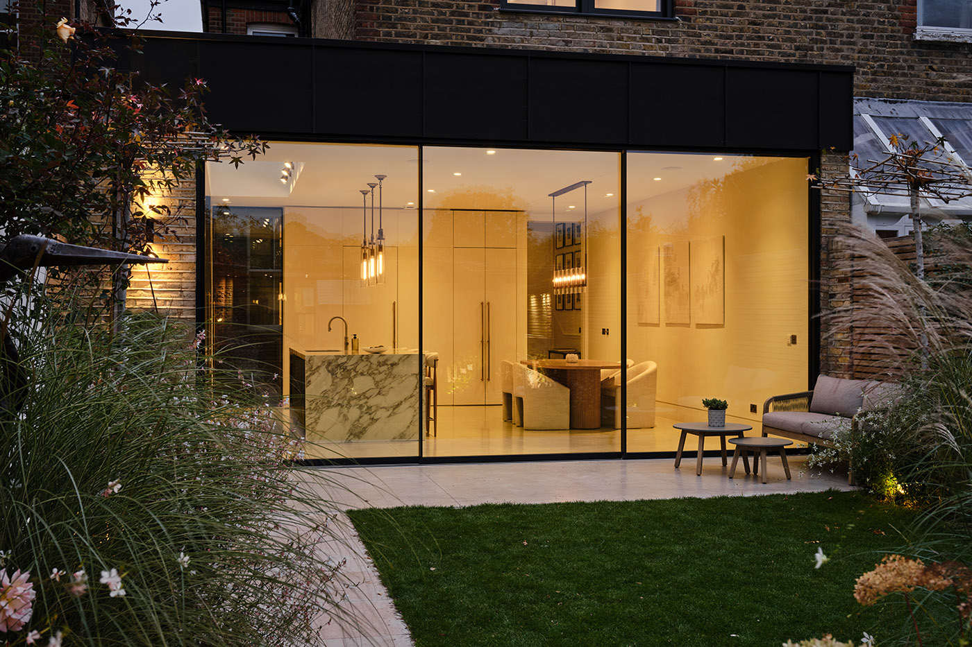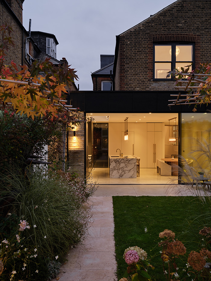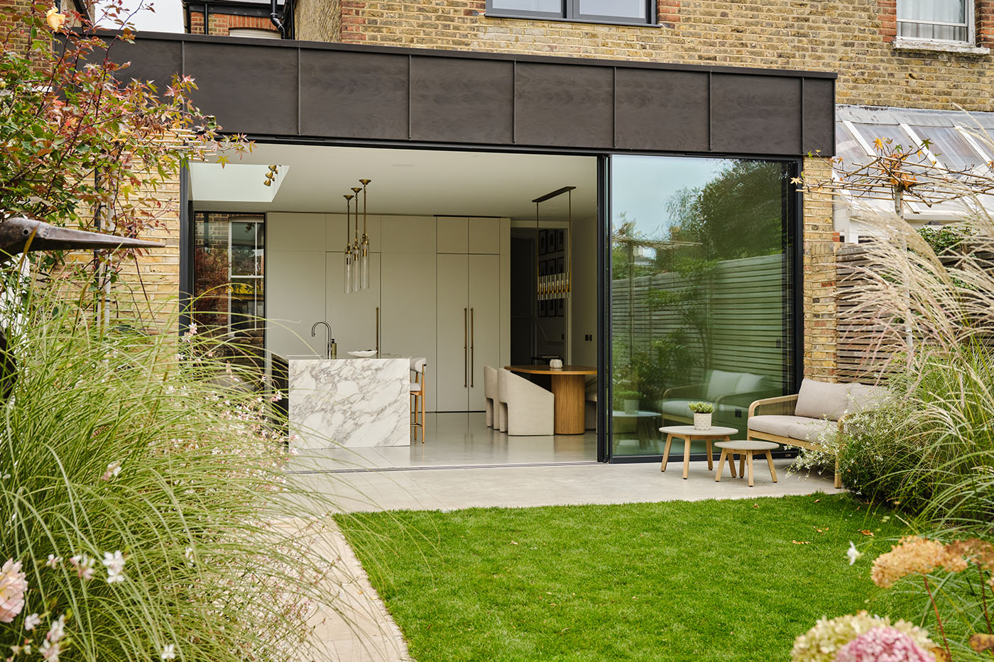 Externally, new zinc cladding introduces a contemporary material contrast, anchoring the extension within its garden setting while offering a subtle dialogue with the existing fabric. An intimate courtyard draws light deep into the home and creates a functional and useful secondary side access that retains the original character of the home. A carefully composed landscape scheme frames the architecture, establishing a seamless connection between inside and out providing a fitting backdrop to a home confidently brought into the 21st century.