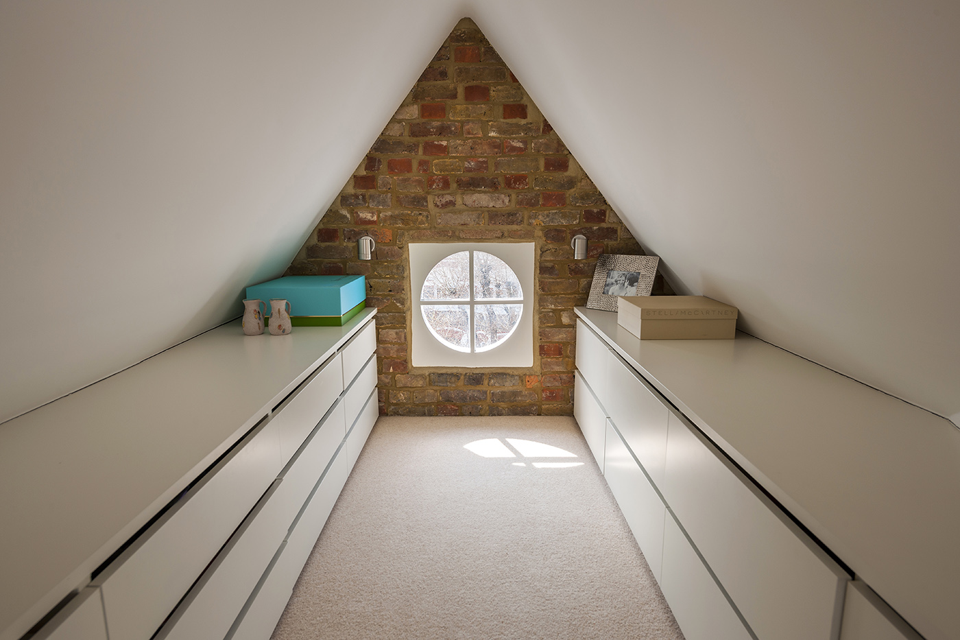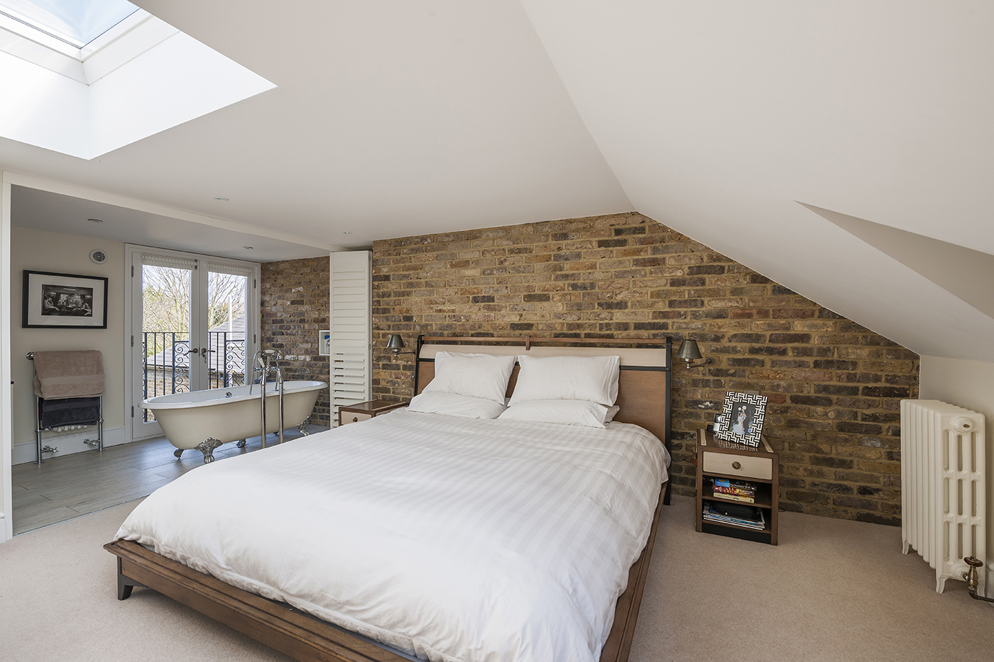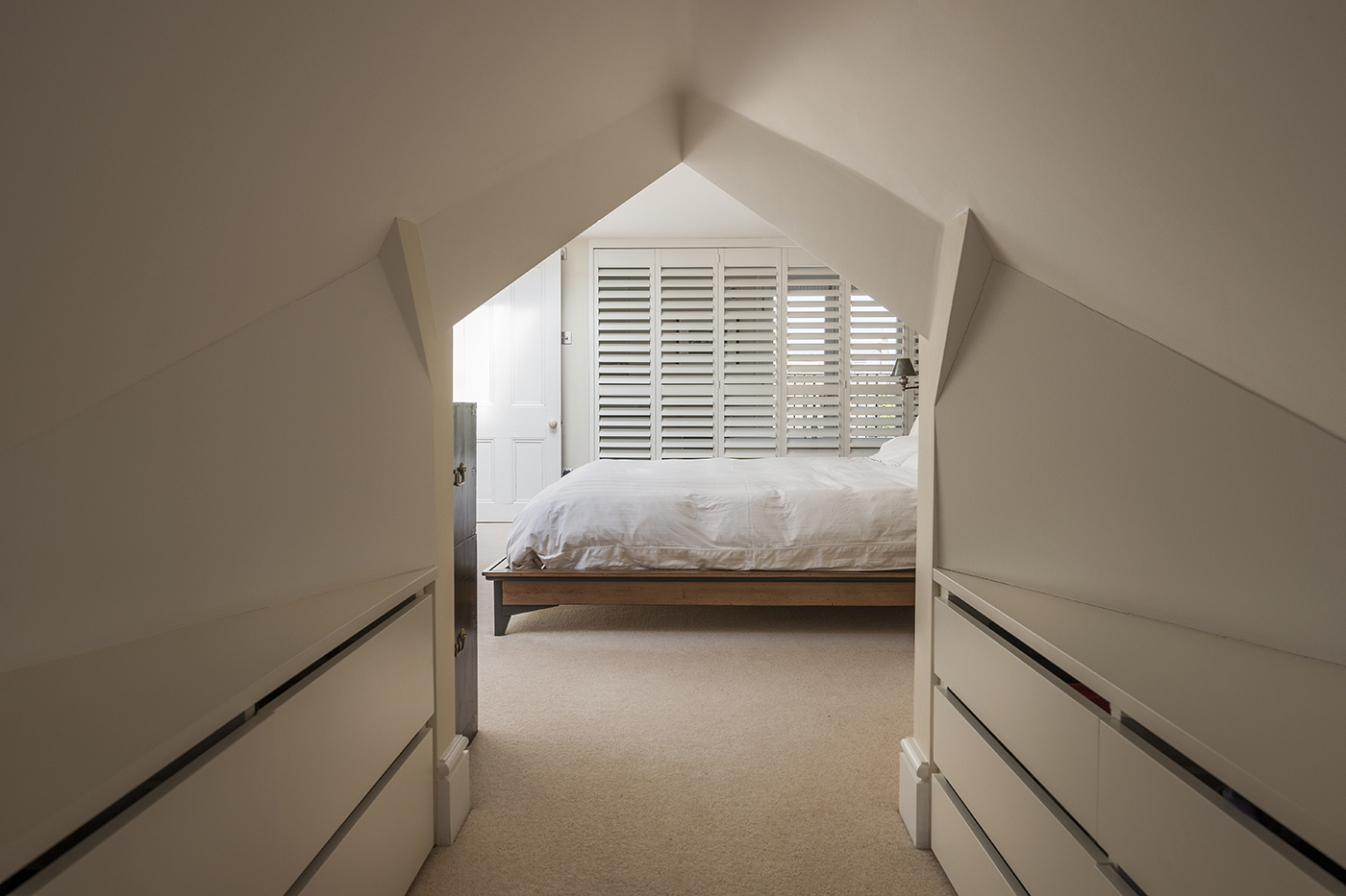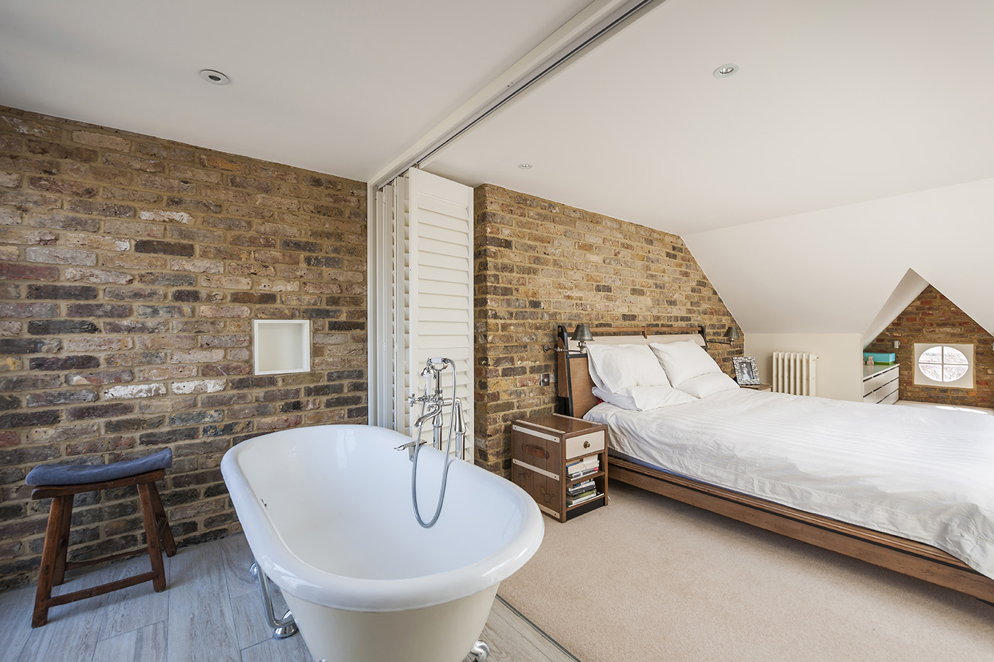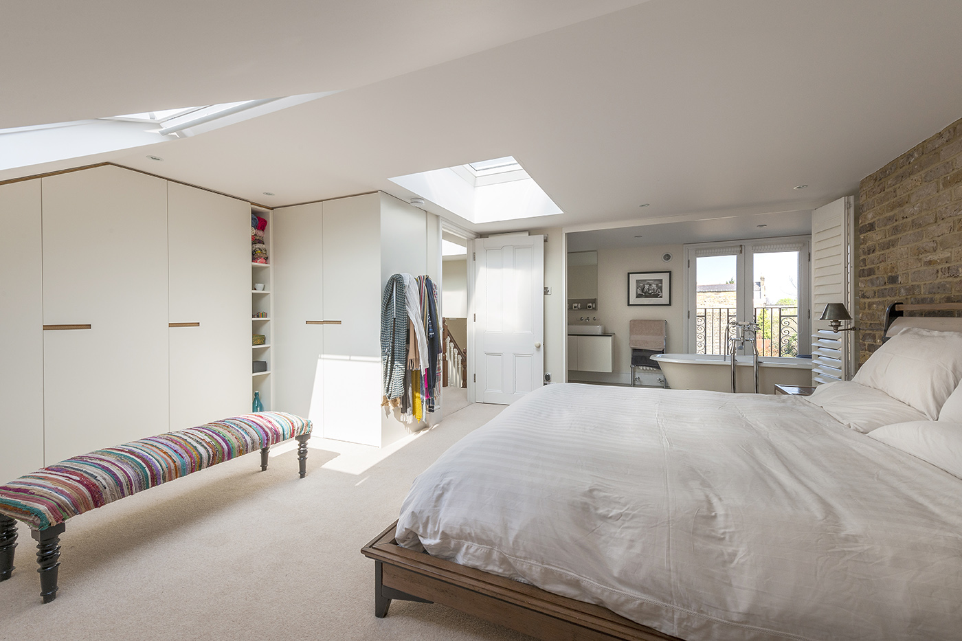 This loft conversion adds a new master bedroom to a three-bedroom terraced house, using bespoke carpentry to make efficient use of the space available. A full width folding partition allows the en-suite to open out to the bedroom, creating a large open plan master suite.