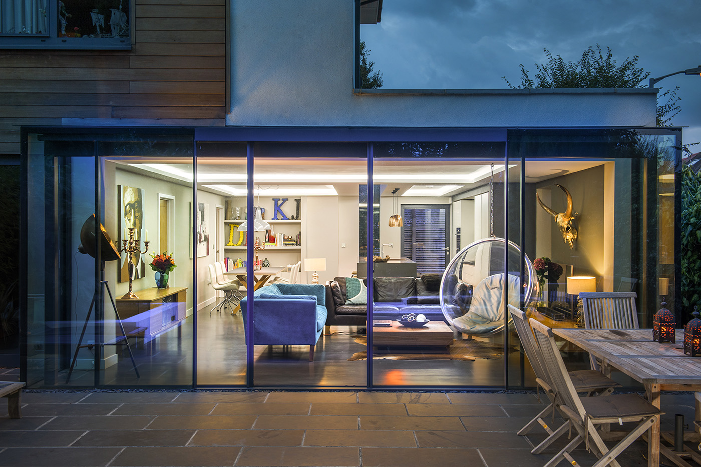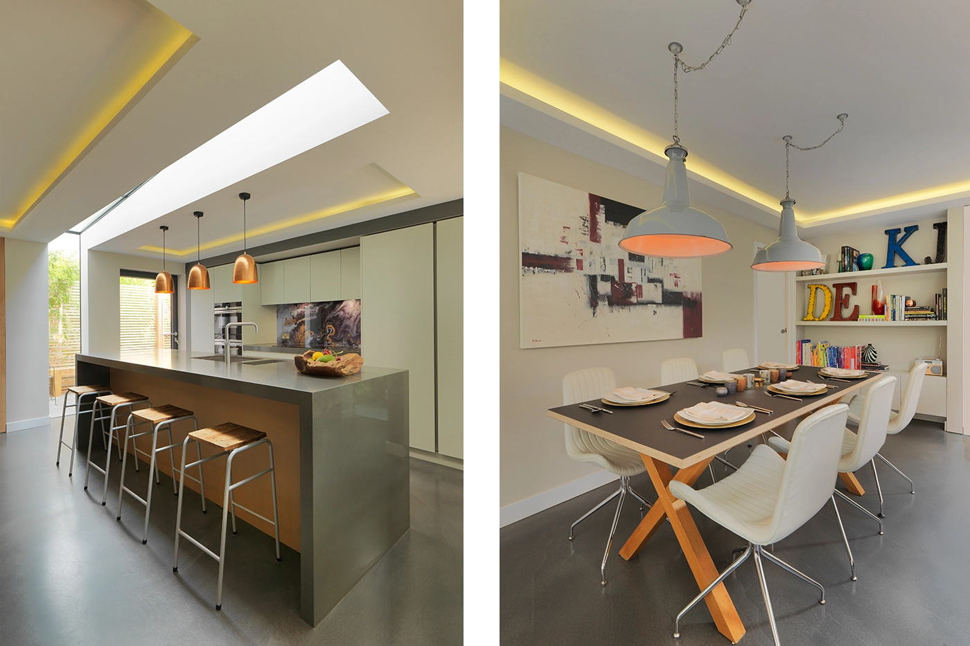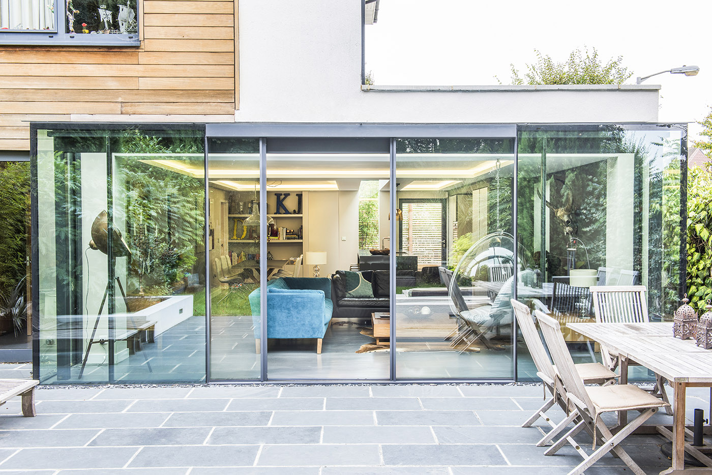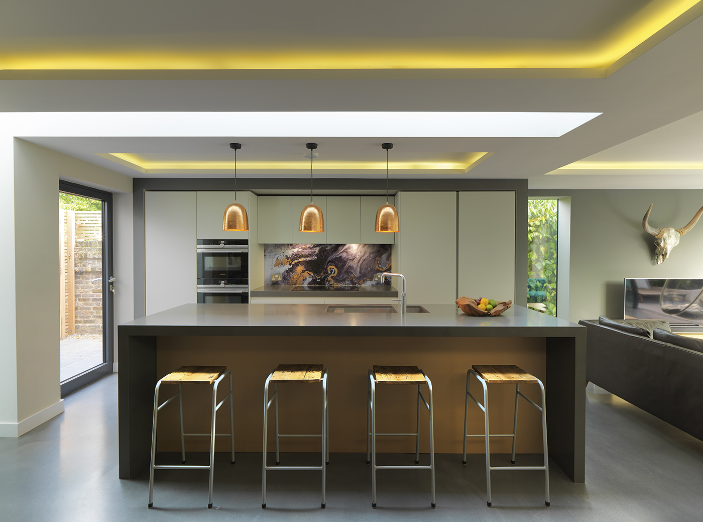 This large side and rear extension features a full width glass box to the rear of the property, affording the new open plan living space with unobstructed views out to the garden. Full width sliding doors allow the space to open up to the outside with a continuous floor level from inside to outside. The main open plan space consists of living, kitchen and dining.