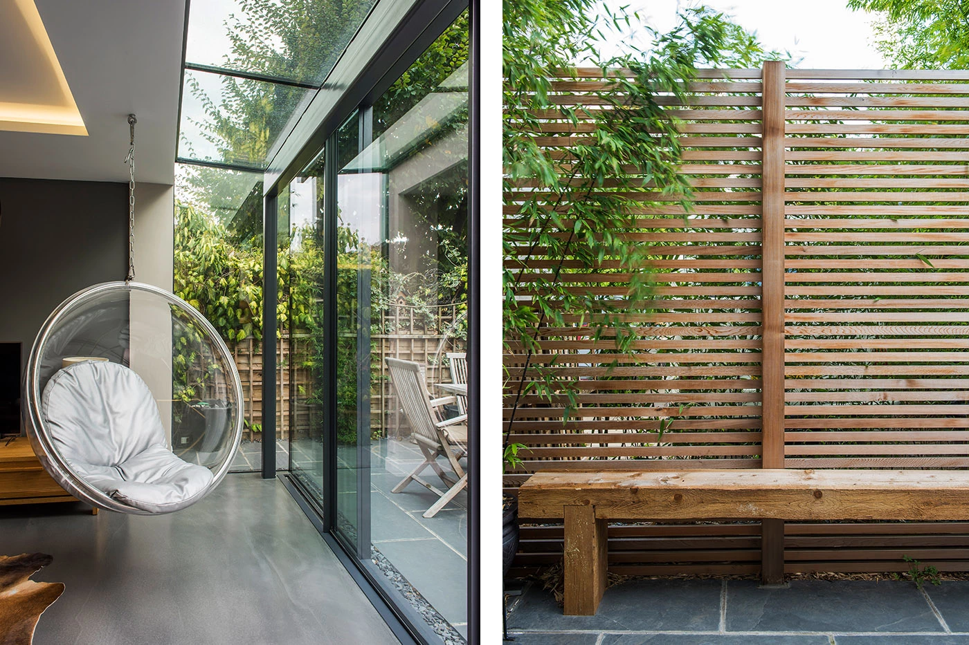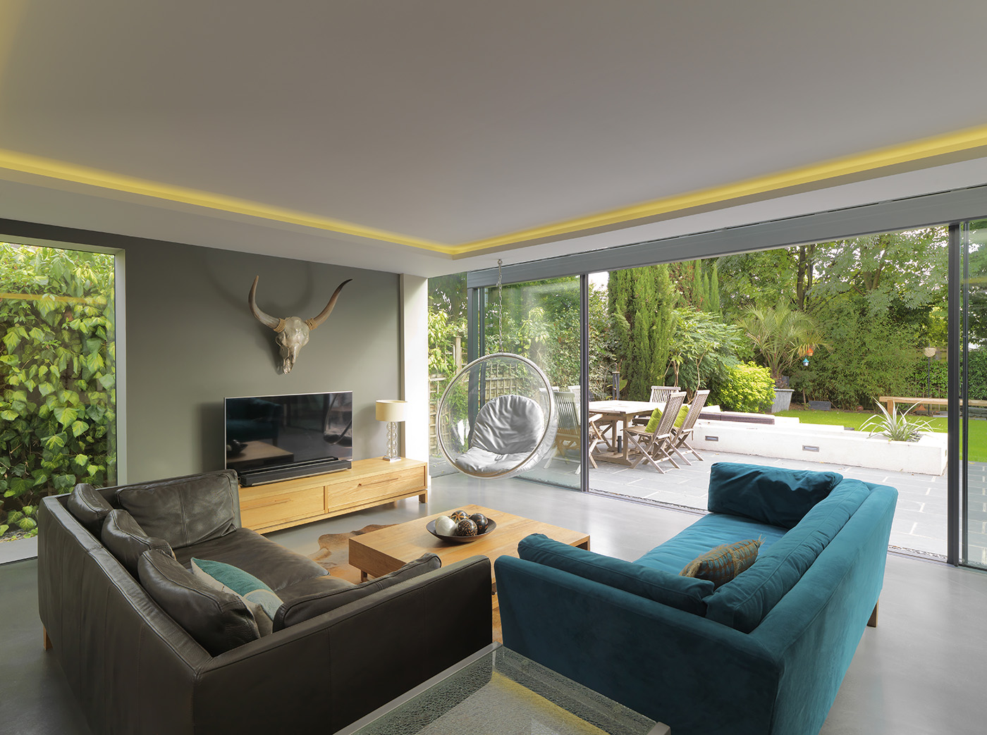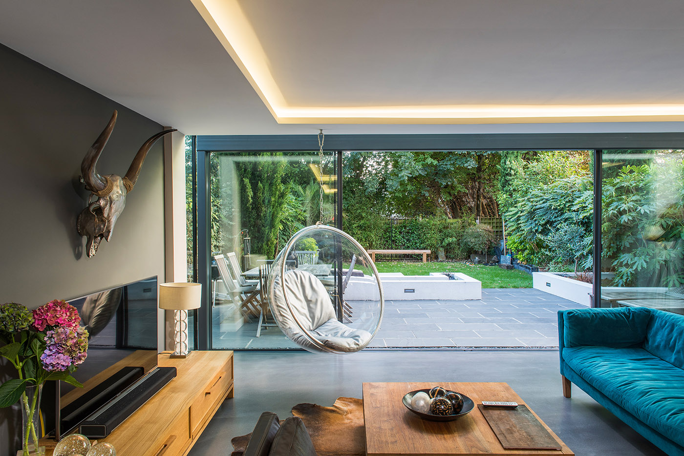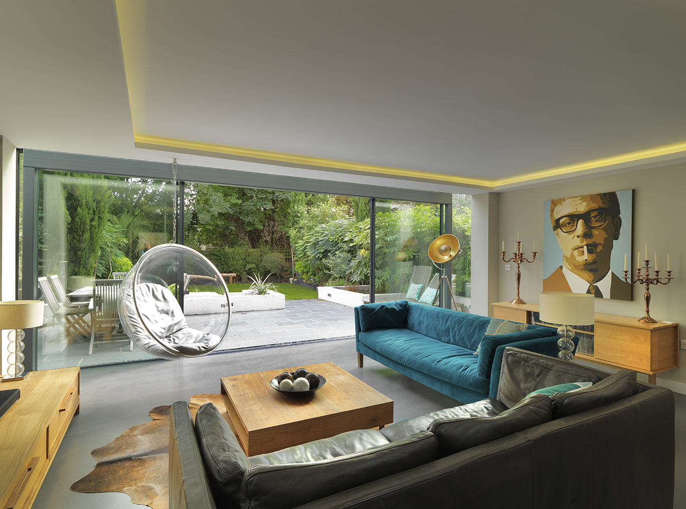 This large side and rear extension features a full width glass box to the rear of the property, affording the new open plan living space with unobstructed views out to the garden. Full width sliding doors allow the space to open up to the outside with a continuous floor level from inside to outside. The main open plan space consists of living, kitchen and dining.
