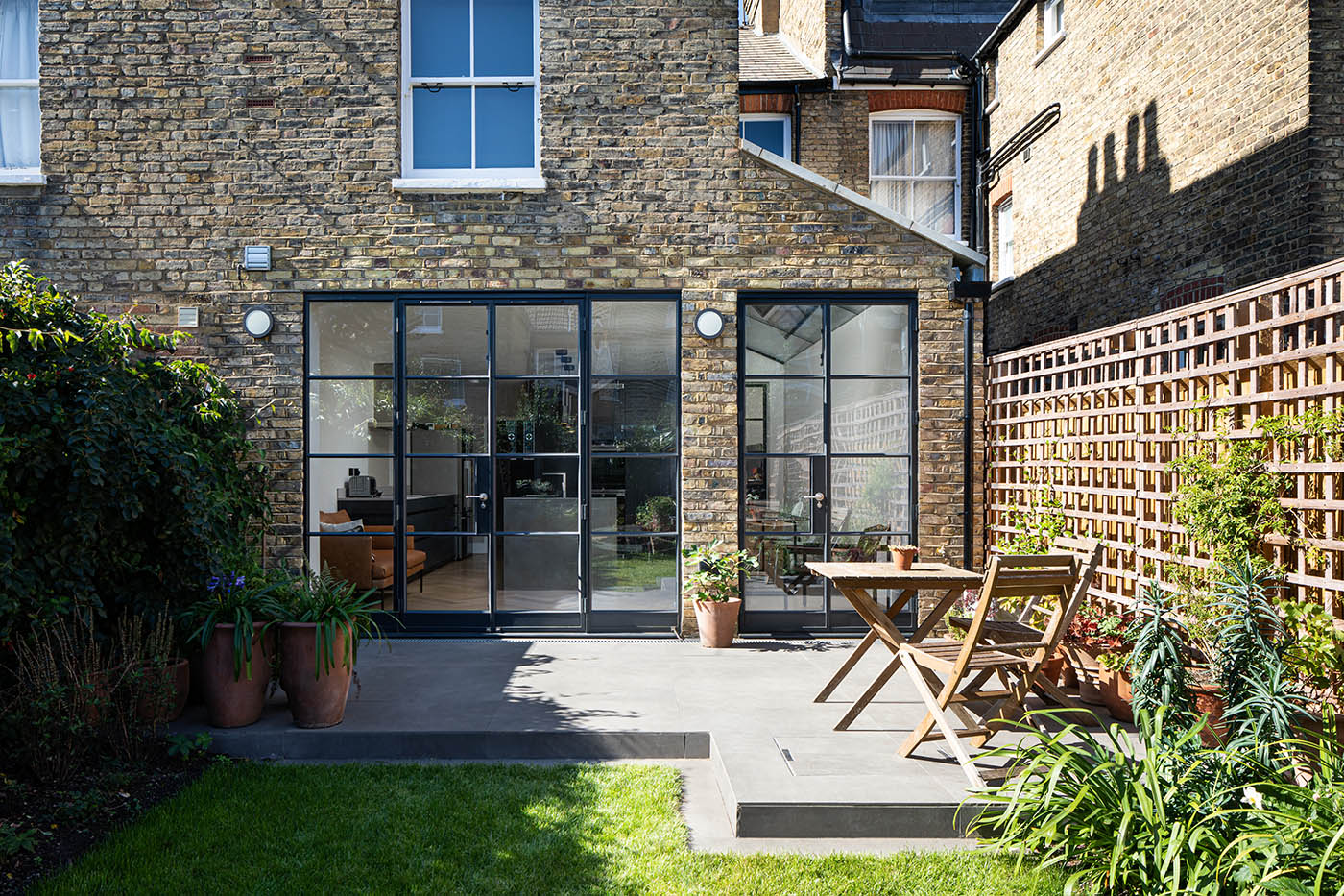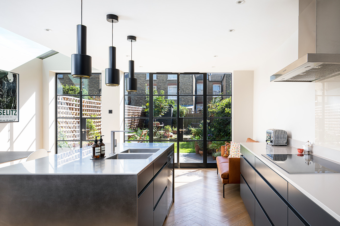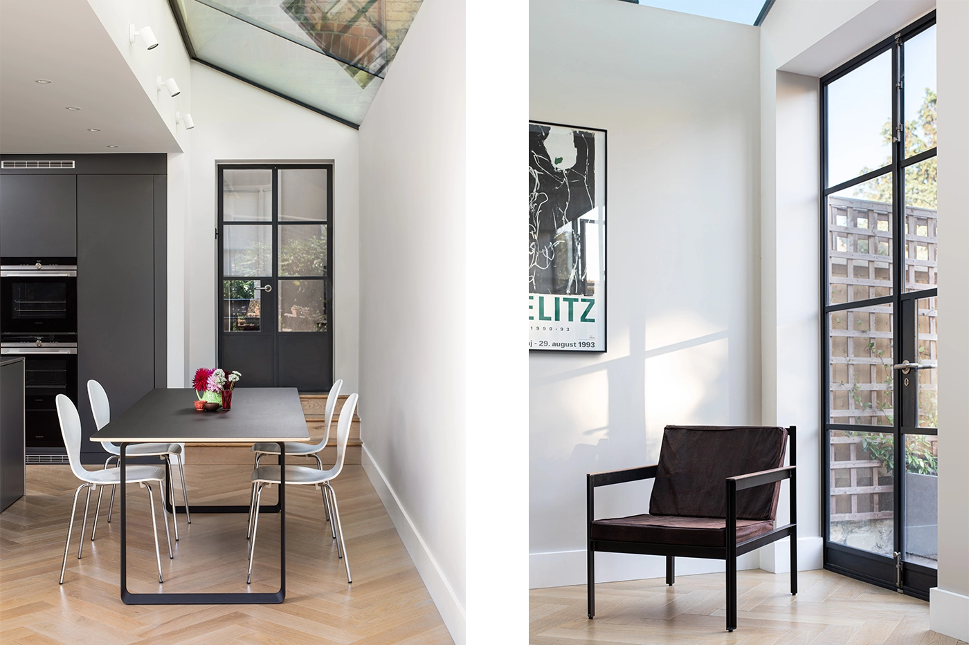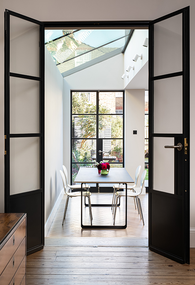 This contemporary side infill extension, in the heart of Balham, aims to bring as much natural light into the deep plan as possible. Floor to ceiling doors and an almost seamless glass roof make this achievable. Internal Crittall doors bring this natural light into the middle zone of the house whilst simultaneously connecting the old with the new. Herringbone parquet floors and a minimalist kitchen create a sleek, stripped back aesthetic.