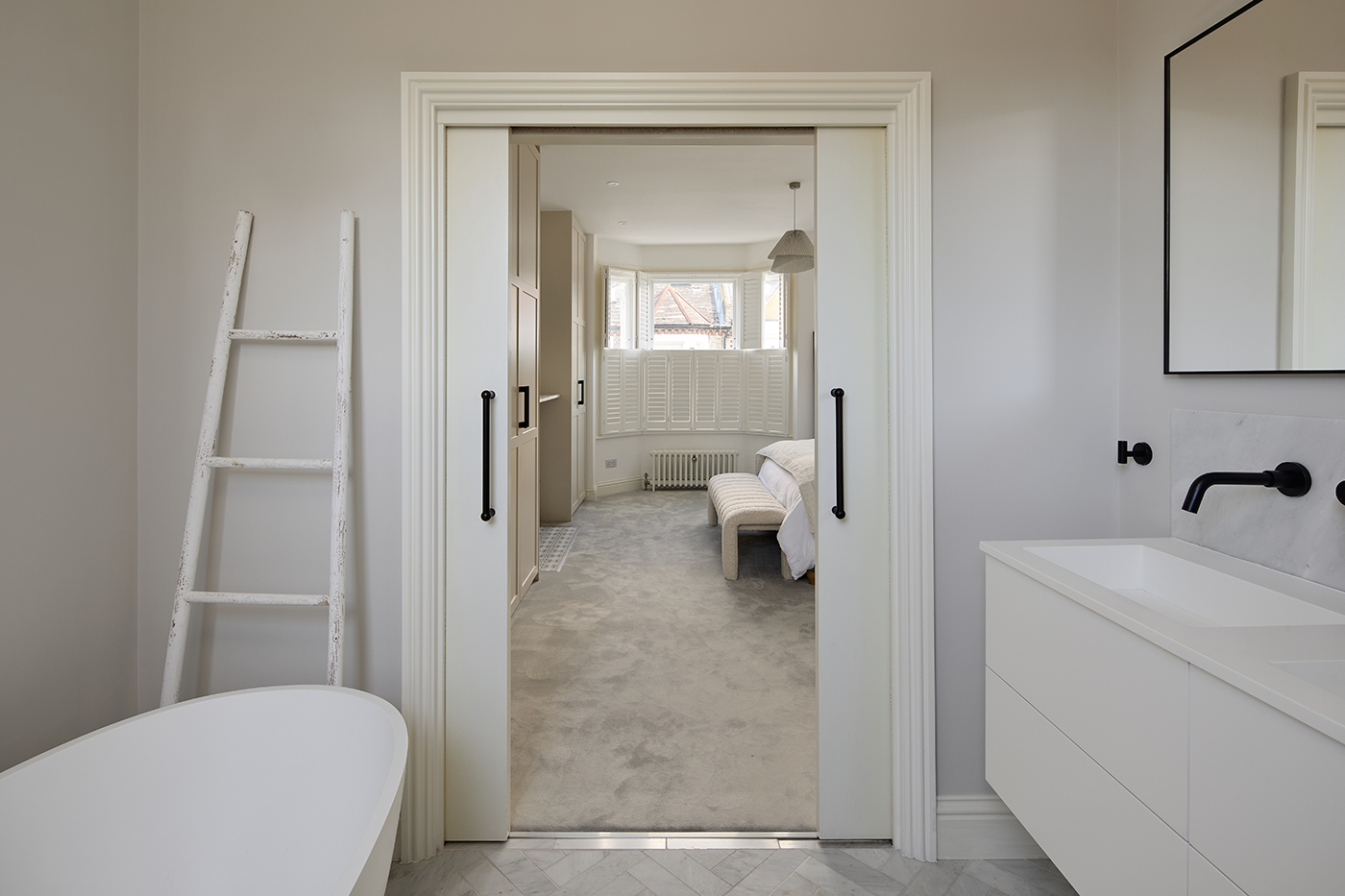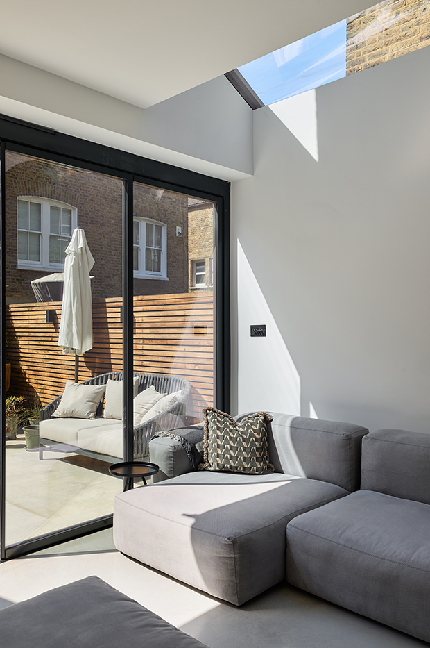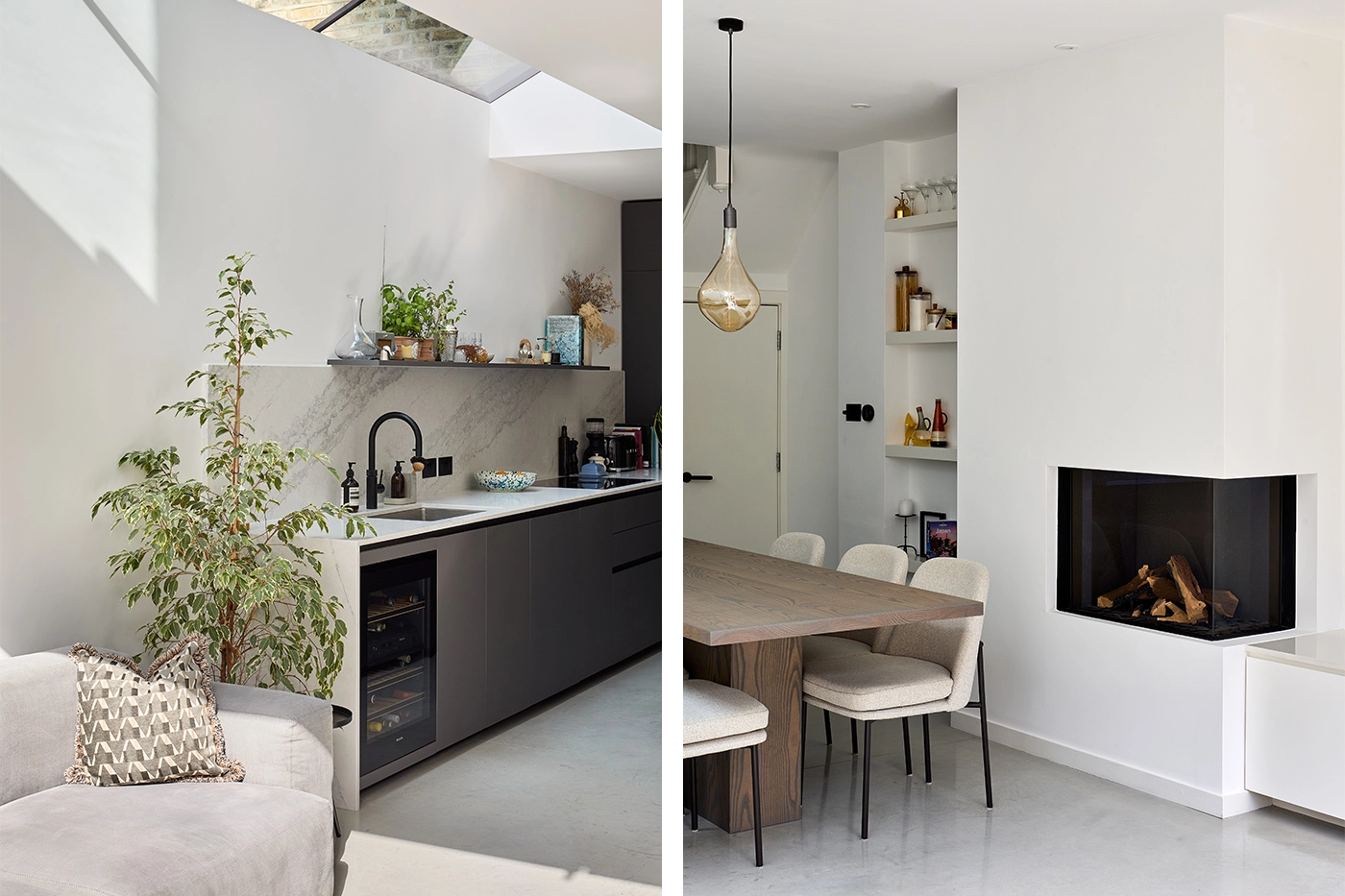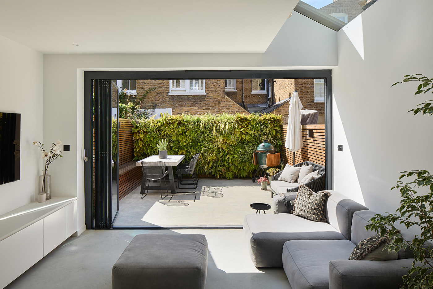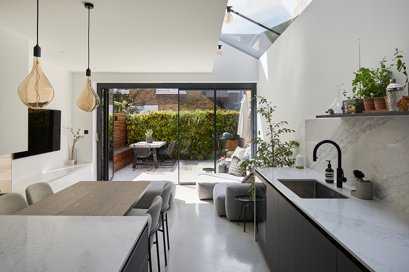 This terraced house has been completely refurbished featuring a side infill and an L-shaped mansard loft conversion. Our practice delivered an unorthodox spatial plan utilising the middle reception room as a kitchen, integrating its functions seamlessly into the living / dining space. The pitched rooflight in the infill paired with fully-openable sliding and folding doors in the rear addition create a sense of openness enhanced by inside-outside polished concrete.