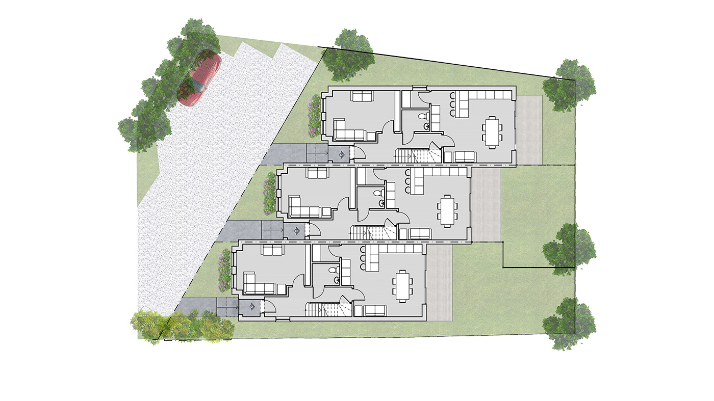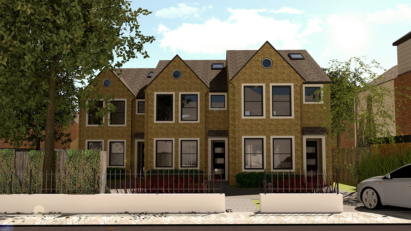 The unique constraints of this site necessitated a completely bespoke design solution: A large Thames Water sewer runs across the site, meaning a large portion of the site which fronts onto the road cannot be built on. The proposed houses had to be staggered in order to accommodate this constraint whilst avoiding impact on the daylight and sunlight received by the neighbouring property. The front part of the site is used to provide the required amount of car parking and cycle storage.